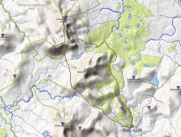 Timing of the stages of the walk worked out approximately as follows: Letterkeen R.L. Praeger Centre - tin hut: 10.5 km - 130 minutes (Bangor Trail very rough track) Tin hut - summit of Tawnyunriddia: 1.2 km - 40 minutes (open hillside) Tawnyunriddia - summit of Slieve Carr: 3.2 km - 55 minutes (open hillside) Slieve Carr - forest edge: 4.1 km - 50 minutes (open hillside) Forest edge - Letterkeen R.L. Praeger Centre: 10 km - 105 minutes (forest tracks) Plus total breaks of around 40 minutes. Total time just under 7 hours.