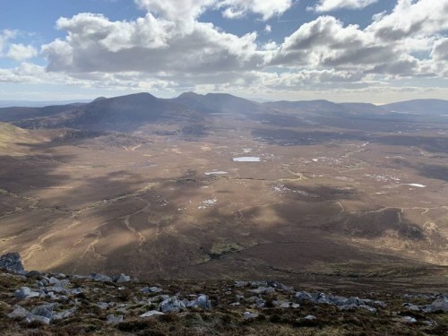 I took a break sitting against Laghtdauhybawn (the name of the large cairn on Slieve Carr), in stillness, silence, and gentle March sunshine. Daithi Ban must have been a very important personage to warrant such a big cairn on a hill so remote from all substantial habitation centres. Coastal views included north Galway, all of Mayo, Sligo, and south Donegal. Mountains included Mweelrea, Sheeffrys, Partrys, Nephin, Slievemore, Ox Mountains, Slieve League, Diamond Hill, and the mighty Letter Hill/Tully Mountain. Islands included Achill, Inishturk, Inishbofin, Clare Island. Huge expanses of bog and forest were near at hand, and the Bellacorrick wind farm breaking up the flat bog to the north. Once again, I had to commend the weather on its fine performance on the day.